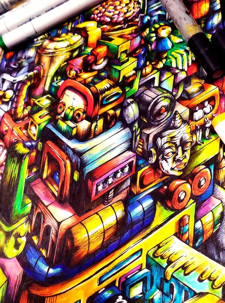 Post-Digital Hive — a watercolor vision by Hans Kristo, pop surrealism artist, capturing the moment when technology forgets its purpose but keeps moving. A colony of machines feeding on the remnants of their creators — survival, repetition, and the haunting poetry of decay.